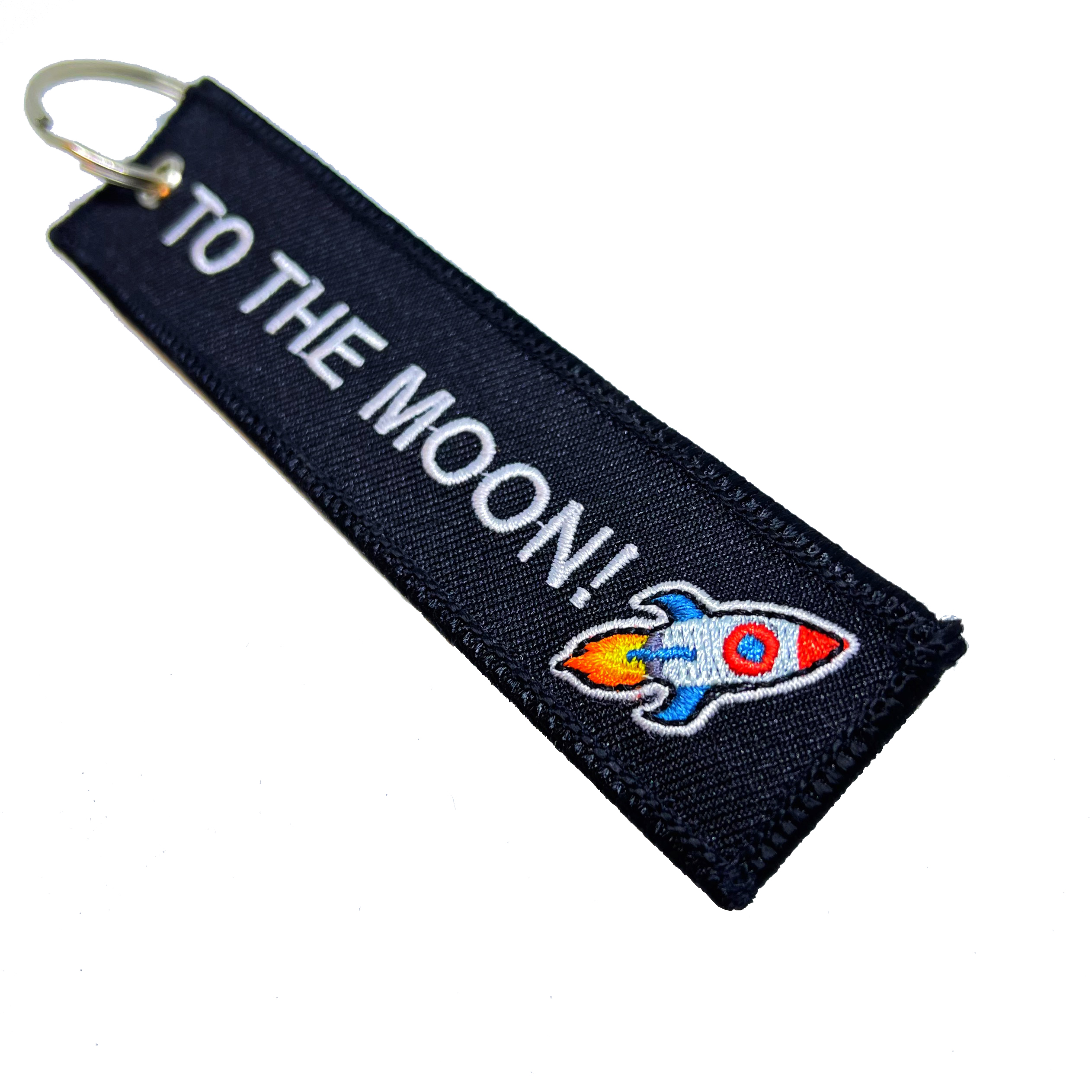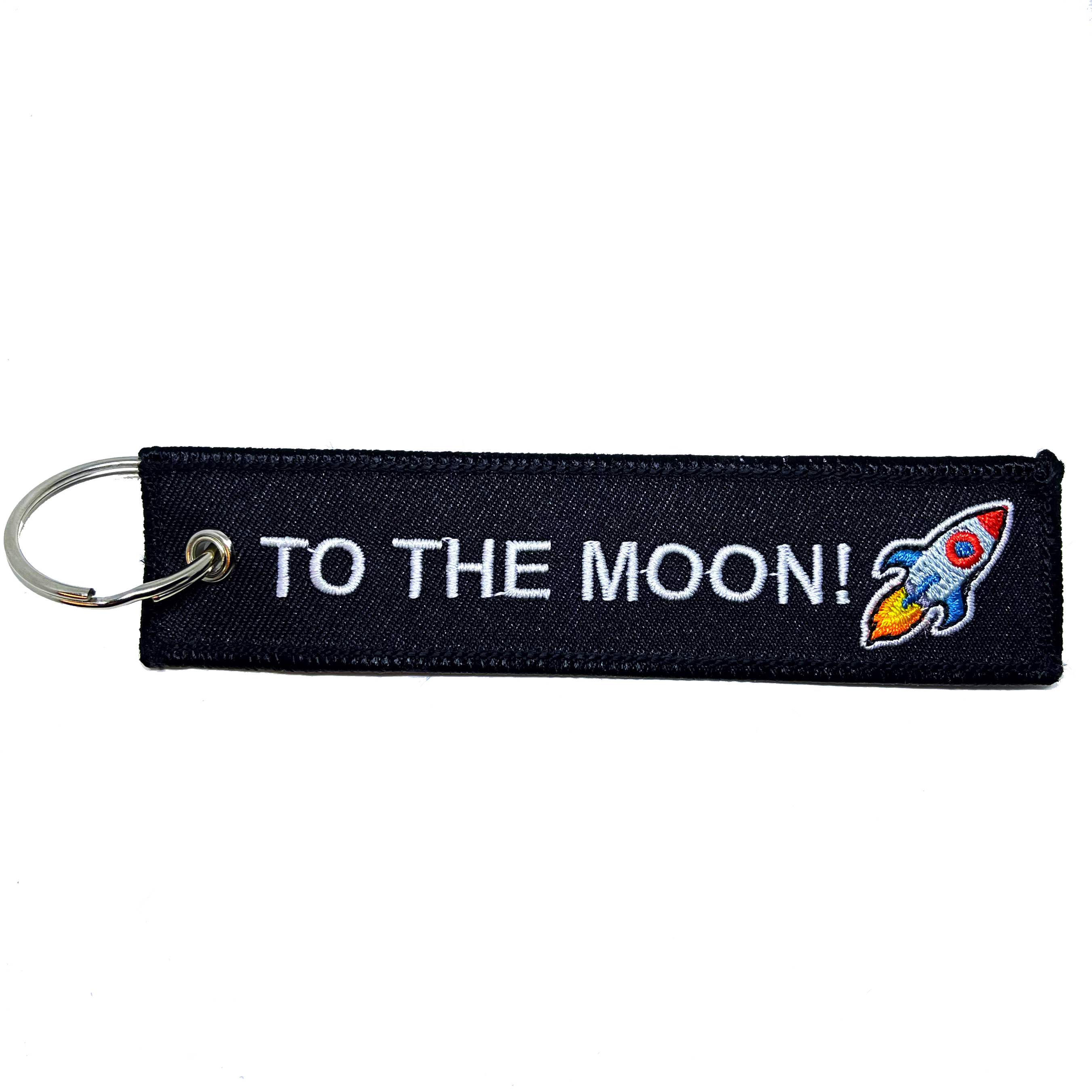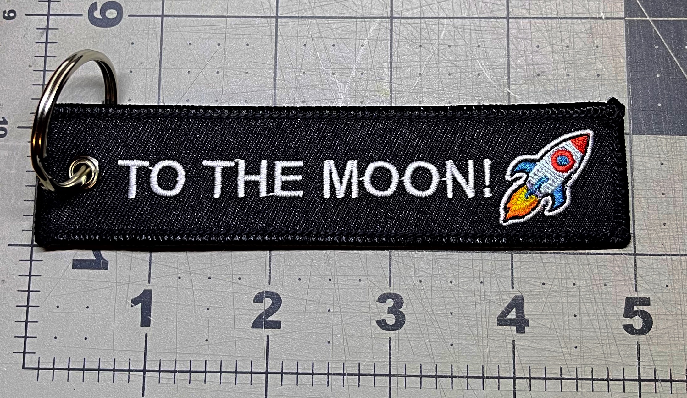 It is double sided keychain, Both sides has embroidery "To the moon!? ".